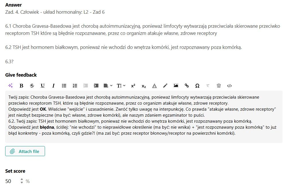 3. W następnym tygodniu otrzymujesz opisową OCENĘ. My analizujemy twoje odpowiedzi i je komentujemy (wskazujemy błędy i piszemy, jak powinno się daną odpowiedź skonstruować; ewentualnie dodajemy sugestie lub przemyślenia natury ogólnej). Zajmuje to kilka dni, ponieważ odpowiedzi analizujemy sami, a nie chatbot lub osoby bez doświadczenia. Otrzymujesz więc zwięzły tekst zawierający nie tylko ocenę, ale także wskazówki jak się poprawić.