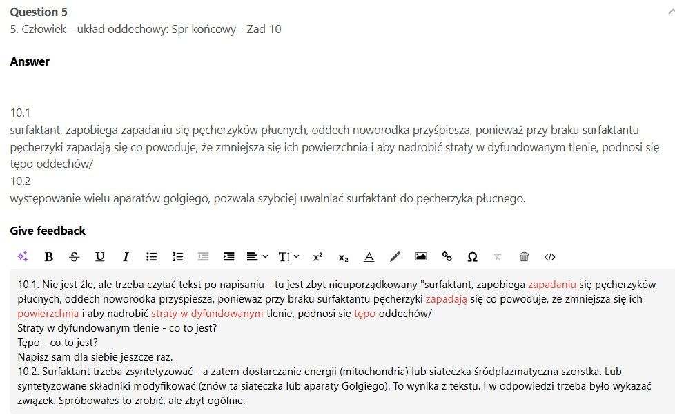 Analizujemy twoje odpowiedzi i je komentujemy (wskazujemy błędy i piszemy, jak powinno się daną odpowiedź poprawnie skonstruować). Zajmuje to kilka dni, ponieważ odpowiedzi analizuje i ocenia człowiek, a nie chatbot. Są to więc konsultacje pisemne.